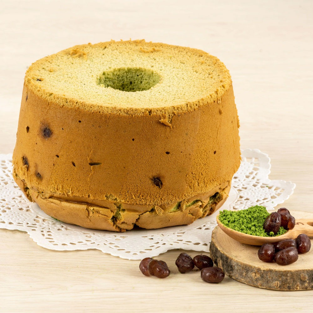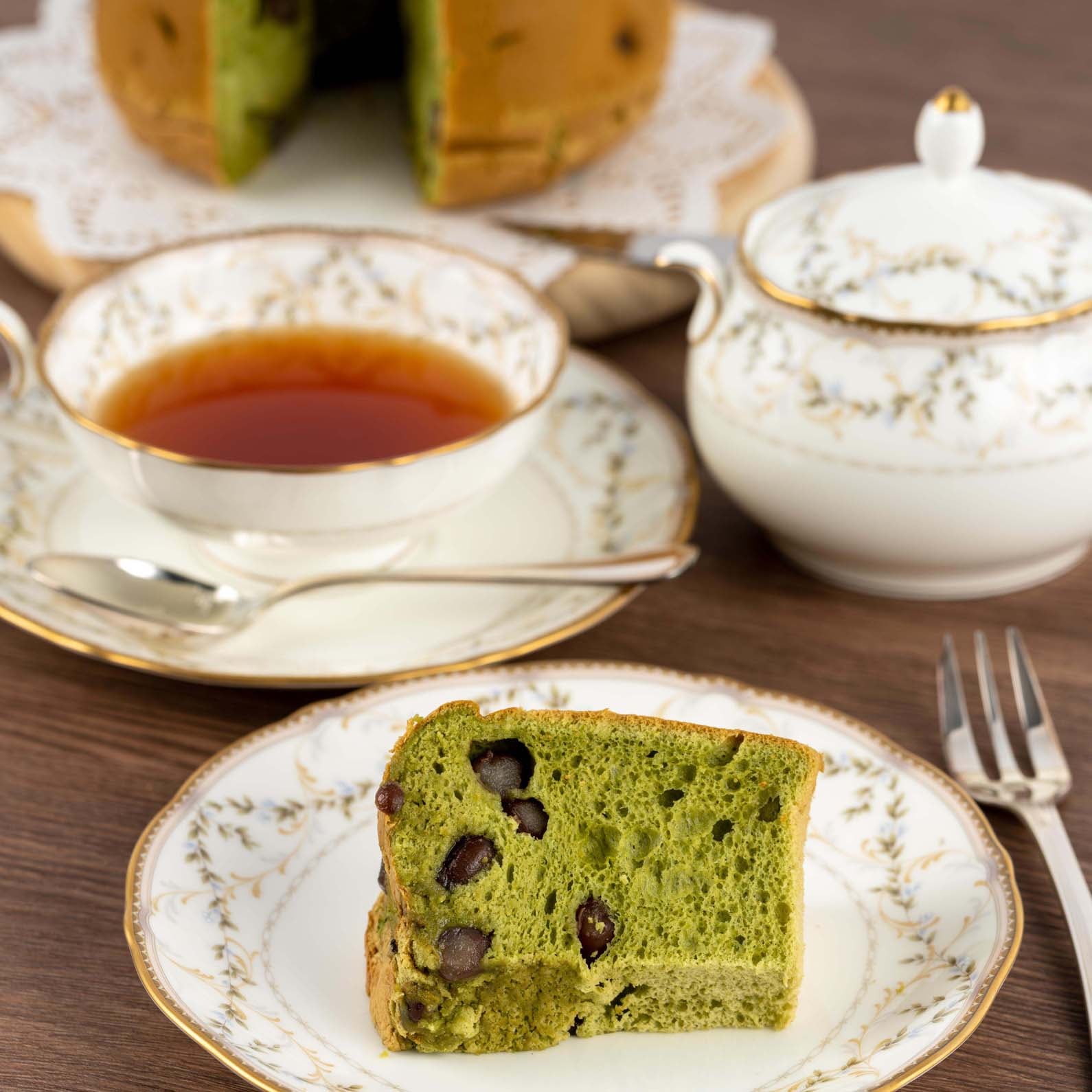 京都・宇治の丸久小山園さんの又玄(ゆうげん)を使用した、もっともこだわって作った抹茶大納言シフォン。