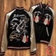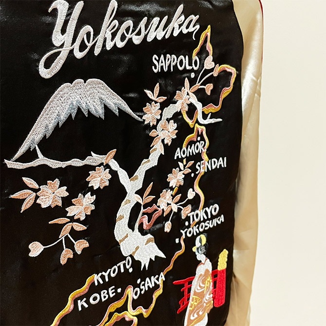 ビンテージ柄とも呼ばれる昔ながらのスカジャンデザインの中でも、特に人気の高い日本地図と舞妓さんの刺繍柄。