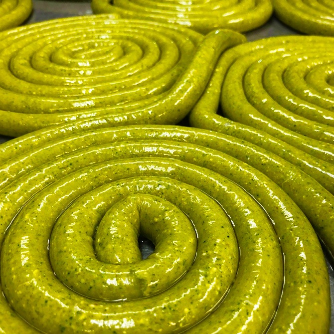 テーブルが綺麗に映える無添加の緑のソーセージです。