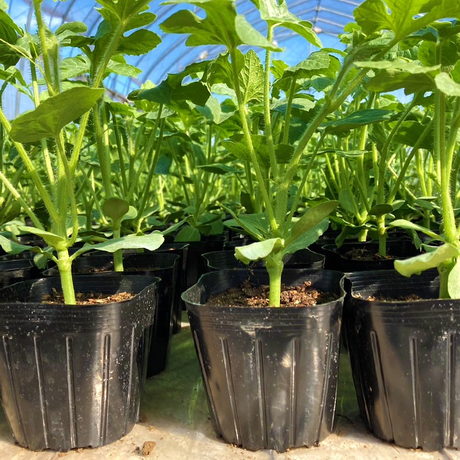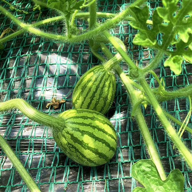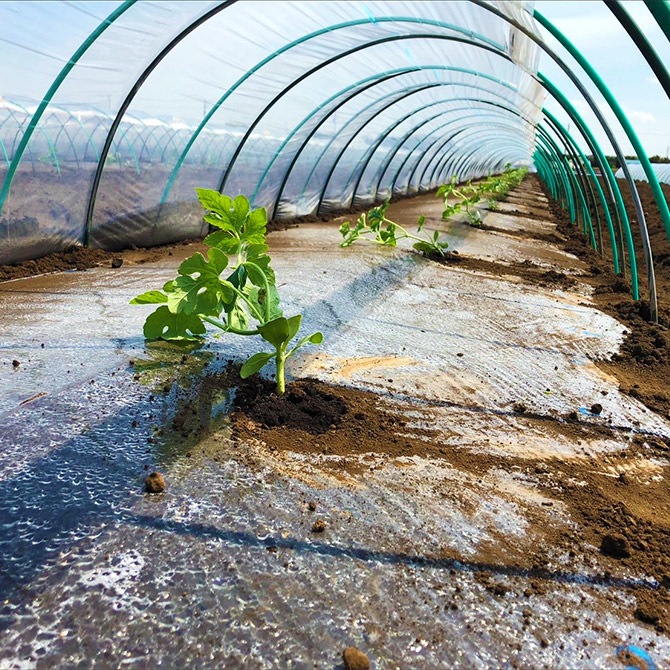 角田農園のスイカは露地栽培にこだわり、露地にビニールでトンネルを作成し、その中で苗を育てます。ある程度の大きさになると、つるを整え、果実の位置を揃えます。その果実の上空にさらにトンネルを作成し、成長する果実の温度を上げる"先がけ方"を用いて、大きさ、糖度の上昇を図っています。