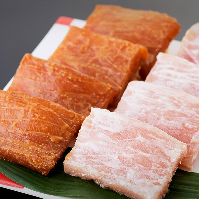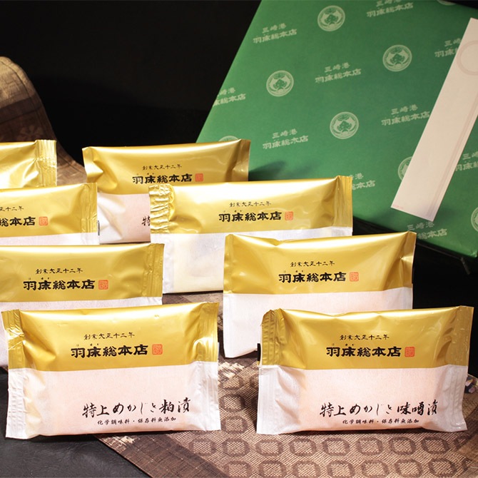羽床の原点でもある、あじきの味噌漬・粕漬けの中トロ部分を詰合せた王道のギフトです。