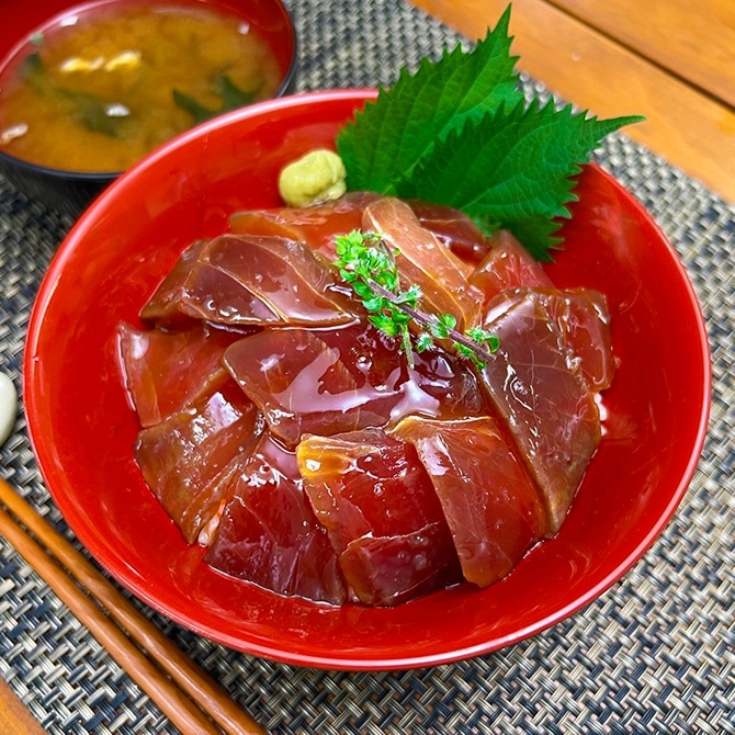 日本有数のマグロの町として知られる三浦港で水揚げされたメバチマグロ。家庭用の大きさにサク取りした、赤身とトロを食べ比べできます。