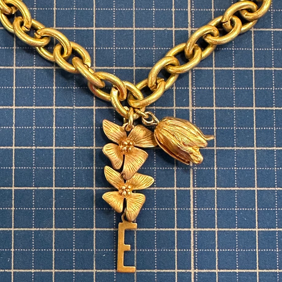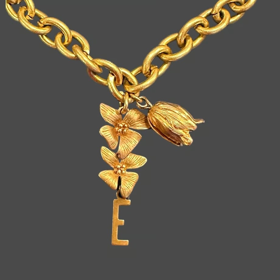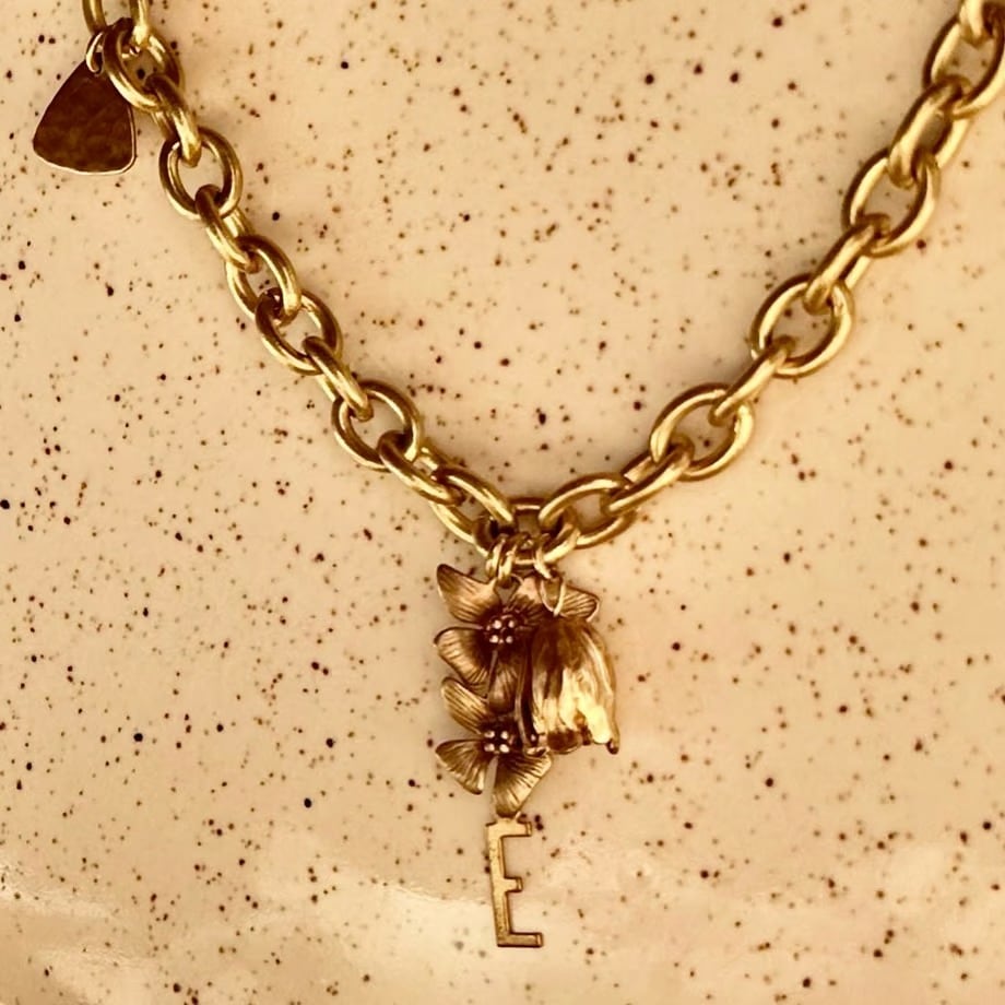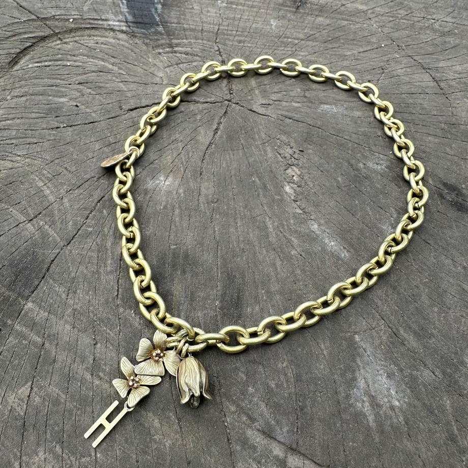 こちらのデザインは、繊細に表現されたお花の先端にイニシャルチャームがついております。