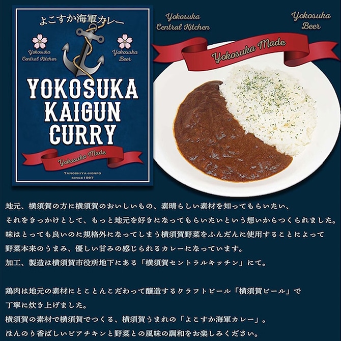 カレーフェスティバルでも大人気だった、よこすか海軍カレー!!横須賀野菜をふんだんに使用し野菜本来の甘みと旨みたっぷりお子様でも食べて頂けます。 横須賀ゴールド片手に、今日も変わらない笑顔のある時間を過ごそう。大切な人への贈り物に、家族団らんのひとときに。