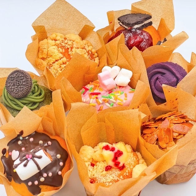 【原材料名】小麦粉(国内製造)、生クリーム、砂糖、卵、食用調合油、ベーキングパウダー、バター(一部に小麦・卵・乳製品・大豆を含む)ココア、抹茶、アールグレイ、シナモン、さつま芋、紫芋、イチジク、苺、オレンジ、ラズベリー、林檎、レモン、ブルーベリー、白桃、栗、ナッツ,オレオ、マシュマロ、チーズ、桜餡、アラザン、ラム酒