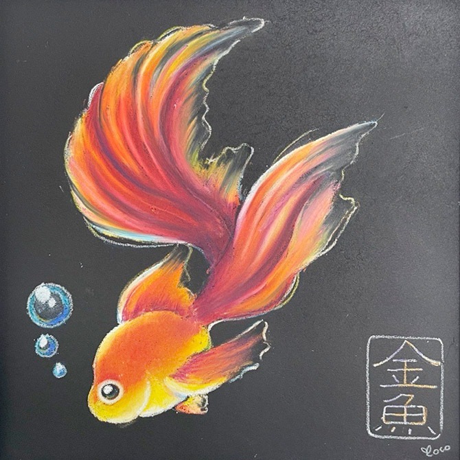 特殊な塗料を塗ったMDFボードにオイルパステルで絵や文字を描くアートです。